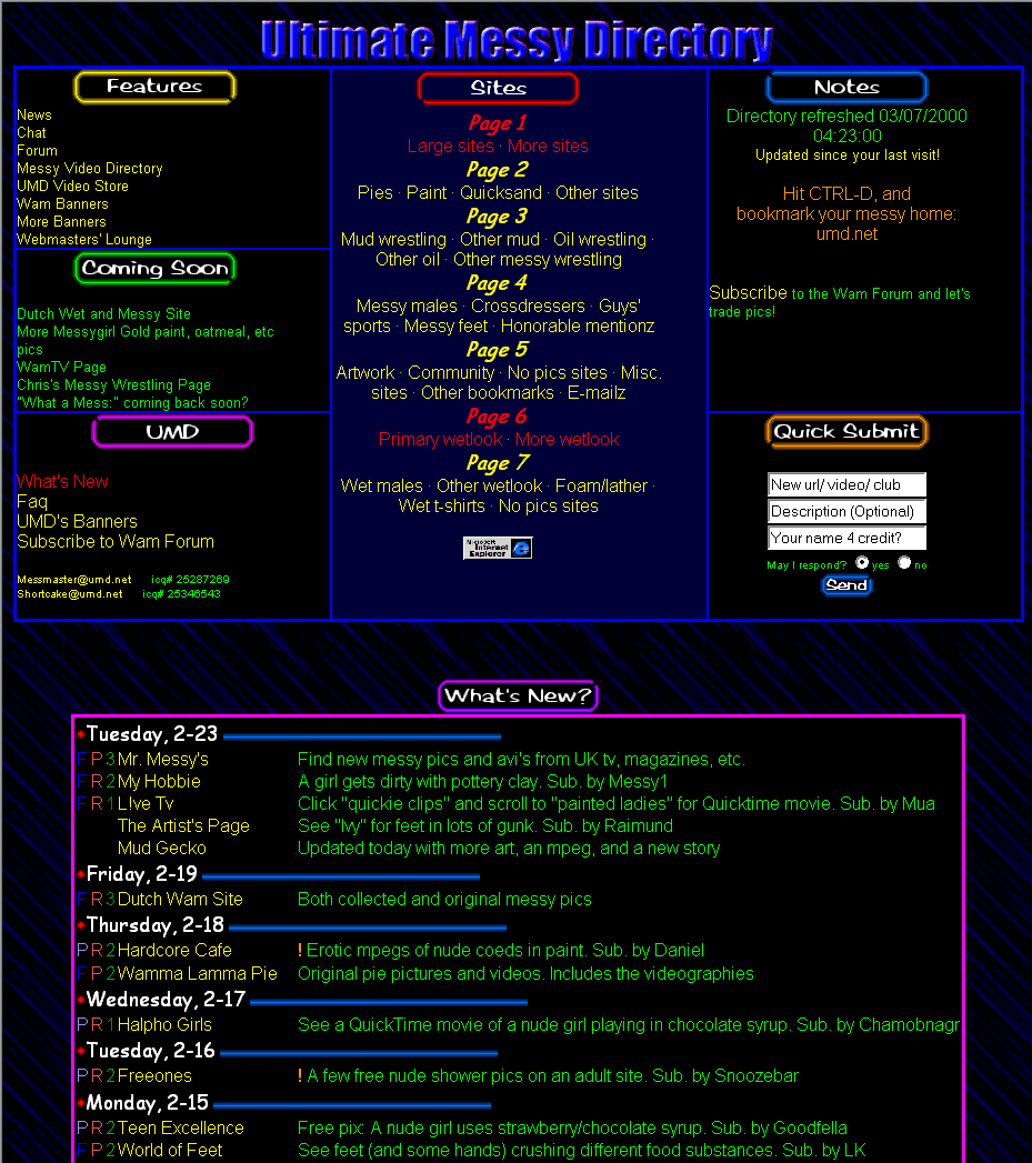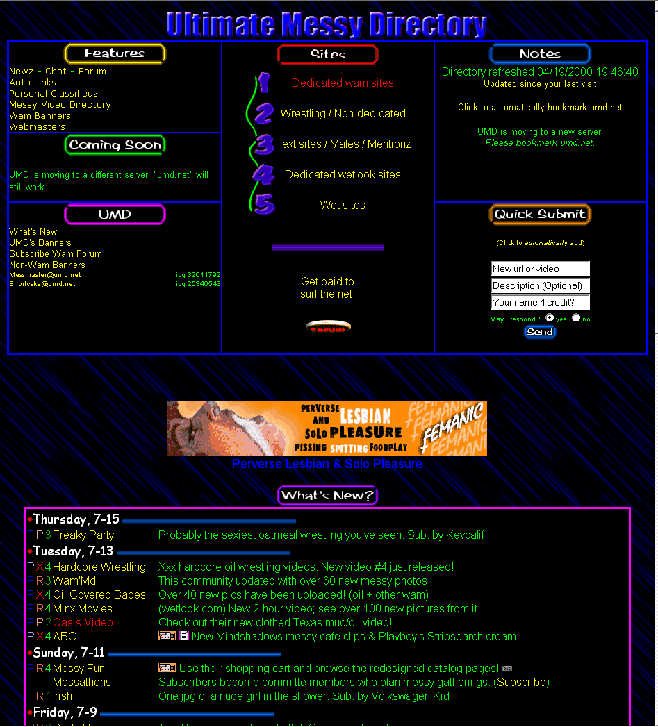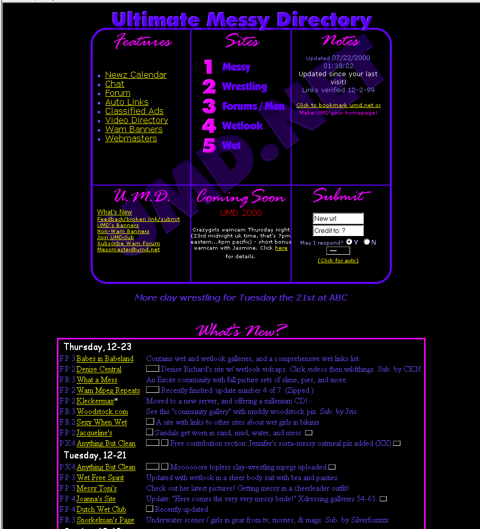 Started in 1998 as a plain collection of text links to various web finds submitted by the very members who frequented the site, we grew within a year to include a chat room, forum, and e-mail list. A good number of people were already aware that wam was "a thing" because of pioneers who had long before released wam magazines, VHS, and web sites. Now folks had another place to meet others who also liked their personal brand of sploshing.